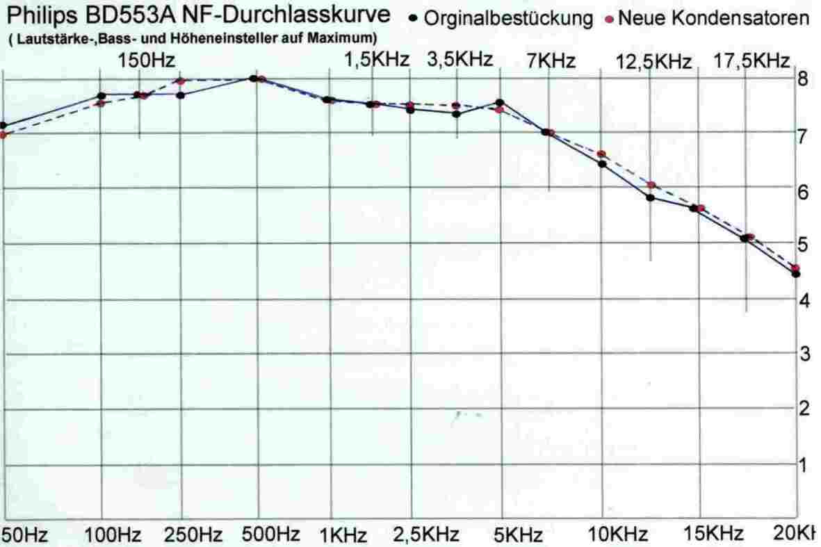 Hierzu haben wir bei einem typischen Empfänger der 50er Jahre (Philips BD553) eine NF- Durchlasskurve aufgenommen.