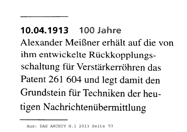 Vor 100 Jahren, am 10.04.1913 wurde das Patent zur Rückkopplung nach "Meißner" erteilt.