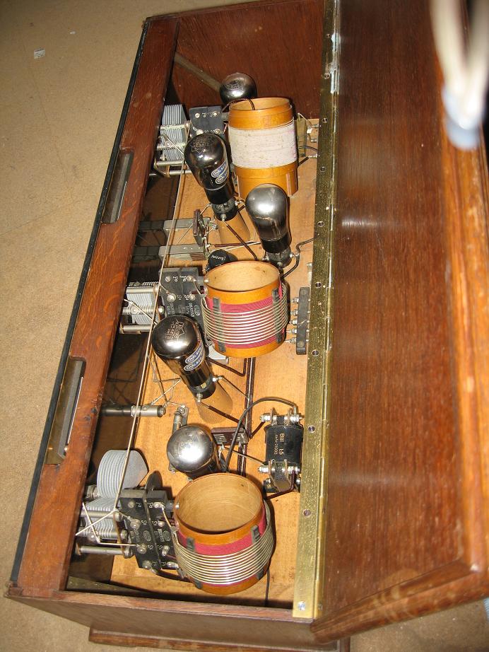 Das passt alles zu dem angelegten Gerät, einem 3-Kreis-Neutrodyn-Bausatz. Es sind offenbar Neutrodynspulen in der typischen schrägen Anordnung nach Hazeltine. Die erste Spule (Vorkreis) besitzt keine Zweitwicklung, weil sie nicht zur Neutralisation benötigt wird, während die beiden anderen Spulen jeweils die vor ihnen liegende 1. und 2. Röhre neutralisieren.