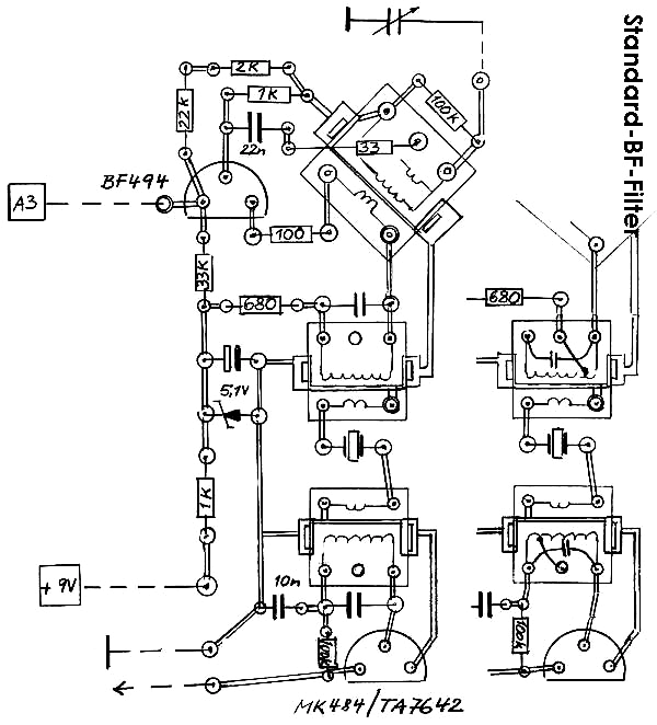 Der Bandfilter 1 (bzw. die Teilwindung zwischen dem Kollektor des BF494 und der Spannungsversorgung) stellt einen frequenzabhängigen Widerstand dar; daher ist diese Teilwicklung Bestandteil der Spannungsversorgung und damit des Arbeitspunkts vom Mischer/Oszillator-Transistor. Die im Schaltplan eingetragenen Werte (Basis: 1.7 V, Kollektor: 3.9 V, Emitter: 1.1 V) sind einzuhalten, da sonst keine zufrieden stellende Funktion gegeben ist.