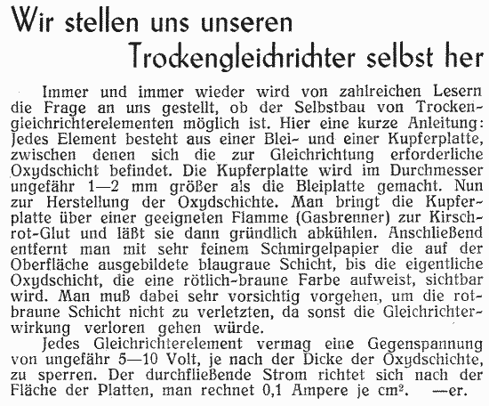 Im "das elektron" Heft 3, Seite 57 Jahrgang 1947 steht ein kleiner Beitrag über die Selbstherstellung eines Trockengleichrichters. In den Notzeiten nach dem Krieg sicherlich eine willkommene Bauanleitung: