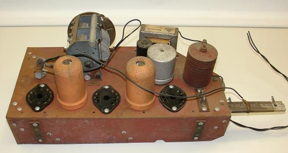 Das Gehäuse ist vom VEB Stern-Radio Stassfurt 4U62, die Skala wurde beim 4E62WK verwendet. Das Chassis ist eine zusammengenietete Konstruktion aus einem Material, das dem "Panzerholz" ähnlich ist. Ich vermute aber, daß die mittlere Schicht aus Pertinax besteht