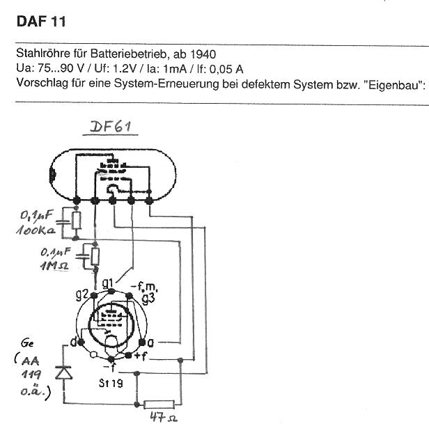EDIT 10.04.09: Ersatzbestückung mit 5678 anstatt DF61 (DAF11) erspart den Shunt-Widerstand; 5672 anstatt 2x DF61 (DL11) brachte -noch- nicht den erwünschten Erfolg...