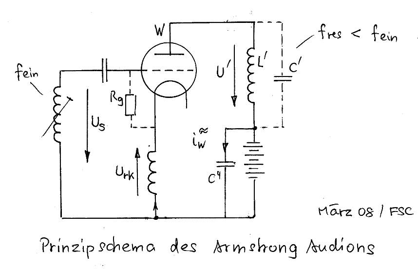 Unter einem Armstrong Regenerative Receiver verstehe ich einen zweiten abgestimmten Kreis in der Anodenzuführung, welcher etwas vom Eingangskreis verstimmt werden muss! Dieser koppelt nicht induktiv auf den Eingangskreis! Die Rückkopplung geschieht rein durch die Anoden-Gitter Kapazität und funktioniert daher auch nur bei Trioden. Das war seine Erfindung, besser gesagt, Entdeckung.