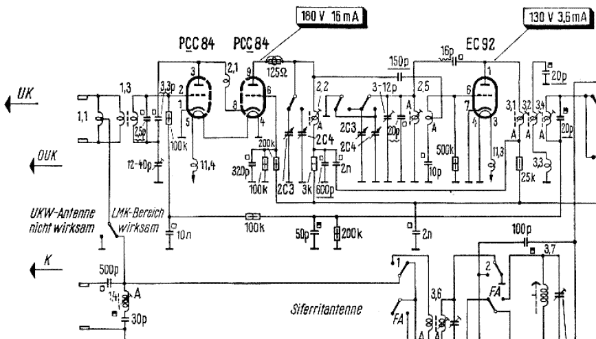 Alles passt, auch der Ferritstab oben drauf. Nur die EF80 sollte eine PCC84 sein (in Cascodeschaltung betrieben). Überprüfen Sie mal Ihren Baustein, ob die Fassungsbeschaltung für diese Röhre passt.
