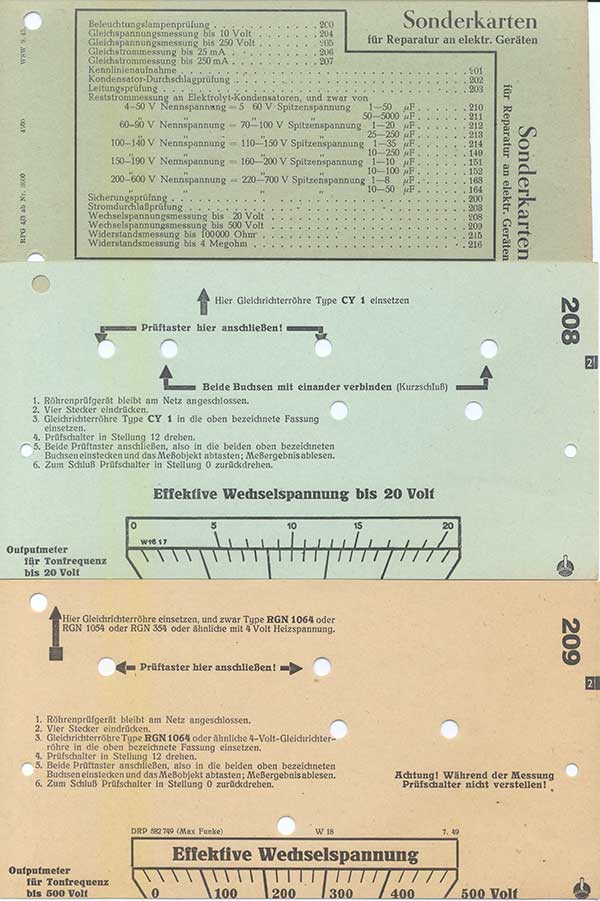 Für die "Reparatur an elektr. Geräten" gab bzw. gibt es "Sonderkarten". U. a. ist es möglich mit dem RPG 4/3 bzw. W18 auch Wechselspannungen bis zu 500V zu messen. Dazu ist es, wie aus den Karten 208 und 209 hervorgeht, erforderlich eine Gleichrichterröhre (CY1 bzw. RGN1064 o. ä.) in die entsprechende Fassung einzustecken.
