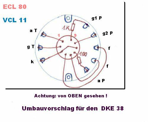 Die VCL11 wurde nach dem Krieg meistens durch mehrere RV12P2000 ersetzt. Viel Auswahl hatte man damals nicht. Heute ist die Situation glücklicherweise ganz anders. Sucht man in den Röhrentabellen nach einem Ersatz für die VCL11, so fällt die Wahl auf die ECL80. Vor allem der Anodenruhestrom der Endröhre kommt sehr nahe an den der VCL11. Das ist deswegen so wichtig, weil die richtige Lage der Schwingzunge im Freischwinger des DKE eben vom besagten Anodenruhestrom abhängt. Mehr darüber hier.