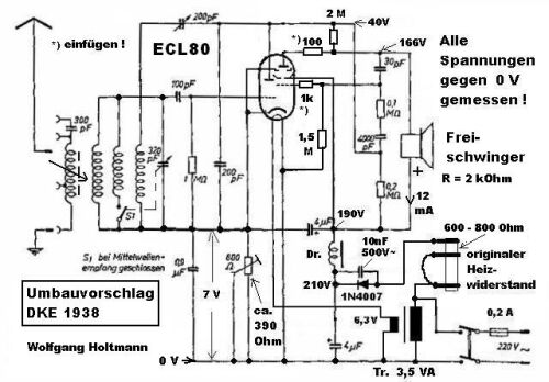 Den muss man also „verstecken“. Das ist eigentlich der einzige Nachteil meines Umbauvorschlages. Dabei gehe ich von der original Version von 1938 -mit der Drossel und dem Entbrummerpoti- aus. Später wurde daran gespart und die Stromversorgung etwas modifiziert.