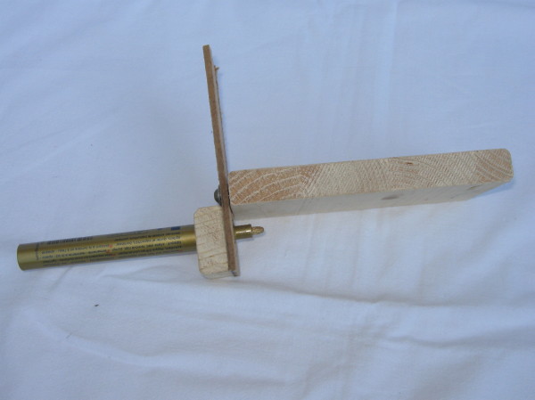 Mit Hilfe einer Führungsplatte (Glattkantbrett) wird der Stift im eingestellten Abstand an der Gehäusekante entlang gezogen. Der Edding mit 2-4mm Strichbreite wird in eine 15mm-Bohrung im Stifthalter stramm eingedrückt. Für den schmaleren Strich mit 1-2mm-Breite ist eine 11mm-Bohrung erforderlich. Damit eine stabile Position des Markers gewährleistet ist, wird auf die 4mm-Hartfaserplatte ein Aufsatz aus einem Leistenrest oder auch Glattkantbrett geleimt.