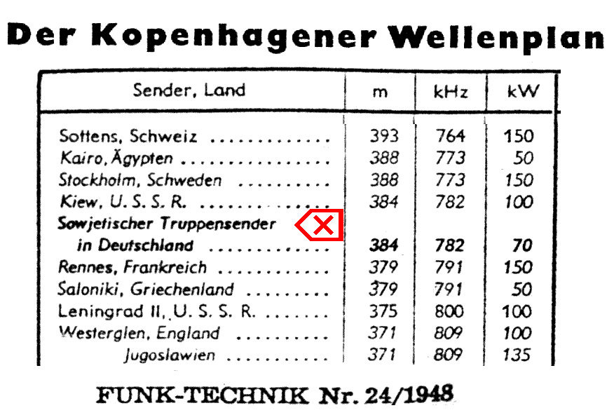 in der FUNK - TECHNIK Nr. 24 / 1948 befindet sich eine Frequenzliste des damals neuen Kopenhagener Wellenplans, in welcher als Inhaber der Frequenz 782 kHz ein "Sowjetischer Truppensender in Deutschland" genannt wird.