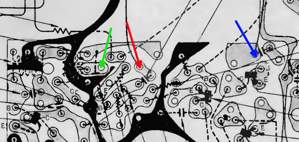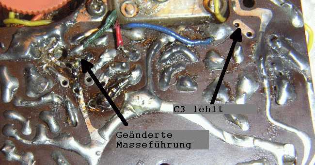 - dann führen die beiden FA-Fußpunkte (ich drückte mich nicht ganz korrekt aus: es müssten zwei Litzenenden in dem einen grünen Schlauch sein) jetzt zur Anzapfung der Oszillatorspule - dort, wo auch der Emitter kapazitiv gekoppelt ist. Lt. Schema sollten diese FA-Anschlüsse aber an Masse gehen. Falls es die Originalverdrahtung ist, kann ich nur vermuten, dass mit dieser Art von "doppelter" Kopplung (Basis-Emitter und Emitter-Kollektor) ein Anschwingen gewährleistet werden sollte. Falls sich nach dem Ersatz des Tr1 ein Pfeifen oder Blubbern - neben bzw. zwischen MW-Stationen - bemerkbar machen sollte, den grünen Anschluss an Masse löten - egal wo. Allerdings hat die Teilwicklung der Oszillatorspule von der Anzapfung bis zur Masse üblicherweise nur ca. 4 Windungen und ist damit widerstandsmäßig unbedeutend - allerdings wie gesagt - wird da gekoppelt!