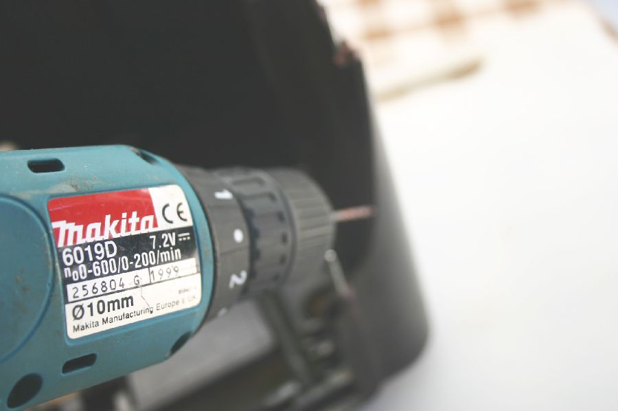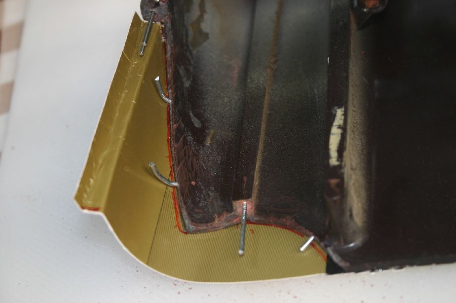 Furação no perfil da zona partida, para colocação de pinos com o objectivo de dar mais resistência ao enchimento de fibra de vidro, em virtude ser uma zona onde vai suportar o peso do rádio. Depois da furação, limpa-se muito bem com diluente celuloso todo o perfil partido para que seja retirado a gordura e sujidades existente.