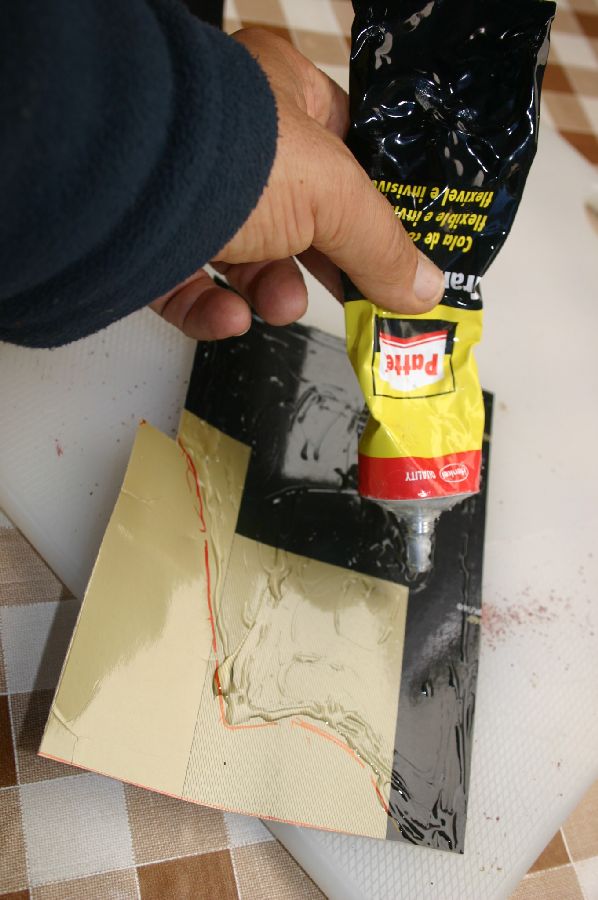 Corta-se uma cartolina, de preferência com uma face brilhante, para cobrir a parte partida, marca-se onde se irá colar e espalha-se a cola de contacto. Isto para que não se suje com cola a zona onde se irá encher com fibra de vidro.