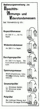 In meinem Bestand existiert ein "Kapazitäts-, Spannungs- und Widerstandsmesser", der mit einer stabförmigen Glimmlampe (150mm lang) arbeitet.