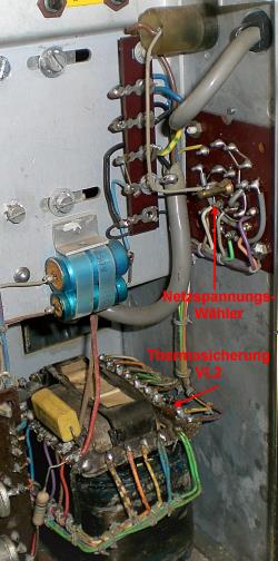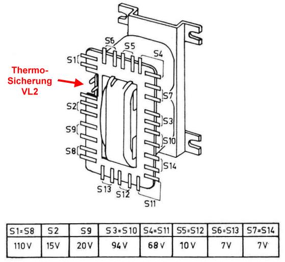 Im Schaltbild sind auf der Netzseite zwei Sicherungen angegeben (VL1 und VL2). VL1 ist leicht auf der Geräterückwand zu finden. VL2 sucht man zunächst vergeblich. Es ist eine Thermosicherung im Transformator, in der Gerätestückliste unter den mechanischen Einzelteilen versteckt.