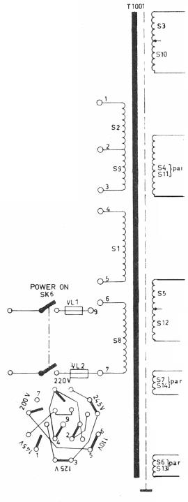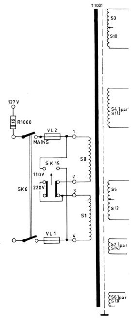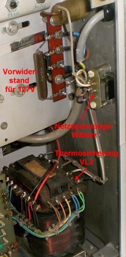 Bei der Geräteversion 06 kann man noch zwischen 110 V, 125 V, 145 V, 200 V, 220 V und 245 V wählen. Bei den späteren Versionen nur noch zwischen 110 V und 220 V, 127 V muss intern auf einen 10 Ohm-Vorwiderstand (R1000) umgelötet werden. Demzufolge fehlen auf dem Netztransformator auch die Wicklungen S2 und S9.