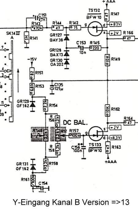 Unter Bild 3 habe ich vom Y-Eingang den Schaltplan von Version 09 und das Foto von Version 13 gezeigt. Mittlerweile habe ich im Internet noch Fragmente einer Handbuchkopie gefunden, die von einer Version mindestens 13 stammen müssen. Die Versions-Nr. ist leider nicht angegeben. Sie muss aber mindestens 13 sein, denn in Version 13 hat der Eingangsteiler einen Trimmer mehr als die Version 12 (an beiden Geräten kontrolliert).