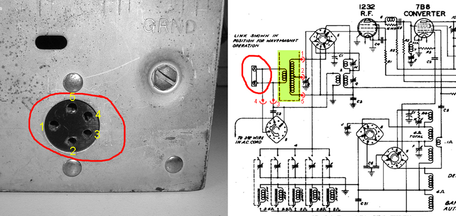 I have a Zenith 7A02 chassis for restauration here. I dowloaded the circuit diagram for this set, and it appears that there is an important difference between this diagram and the chassis i have here. The diagram mentions only two connection points A and G, but the rear ot the radio has a 5-pin connector for the antenna.