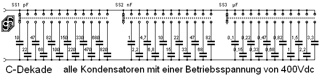 Anders liegt die Sache bei C-Dekaden, diese sind sehr teuer, daher lohnt sich hier ein Selbstbau. Verwendet wird das preisgünstige Gehäuse wie beim ISOTEST, aber in hoher Ausführung BHT 124 x 53 x 70mm. 3 Stück Stufenschalter 1 x 12 und die nötigen Kondensatoren mit min. 400V Betriebsspannung. Natürlich können auch Kondensatoren mit höherer Betriebsspannung verwendet werden. Dann muss aber geachtet werden, ob alle im Gehäuse Platz finden. Die verfügbaren Kondensatorwerte reichen von 10pF* bis 3,3 µF. *Bei einer Messung hat sich herausgestellt, dass der kleinste Wert ca. 40pF beträgt. Dies ergibt sich durch die unvermeidliche Kapazität der Verdrahtung und Verkabelung. Das heisst ca. 30pF müssen immer zugerechnet werden, dies ist besonders im pF-Bereich (SS1) wichtig.