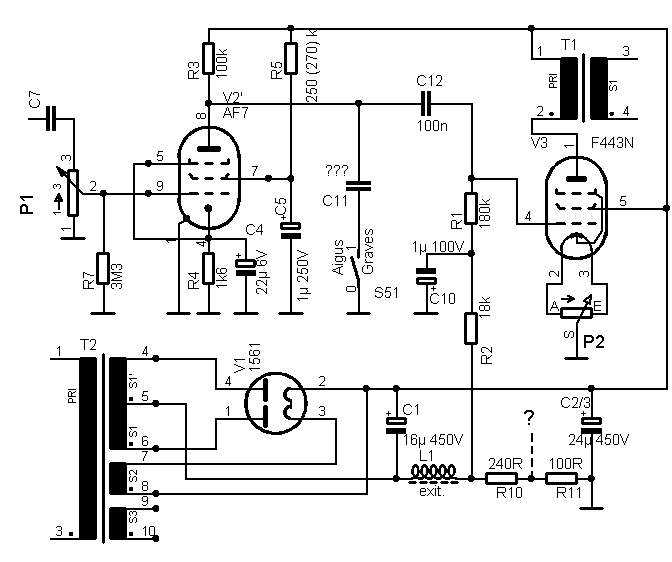 Auch würde ich die AC2 ganz normal in Kathodenbasis- Schaltung betreiben. Die Tonblende (Graves-Aigus) würde ich entweder ganz weglassen, oder mit S51, C61 und R71 vor die AL2 schalten. (Bei AF7 würde R71 entfallen)