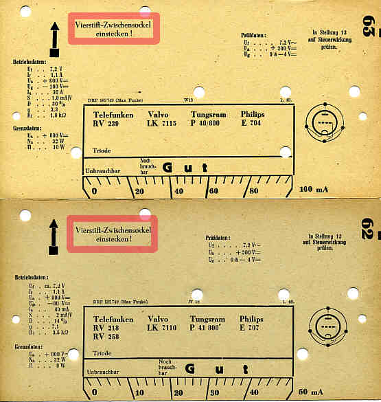genau so ist es. Habe mir die Sache auf meinem W18 angeschaut. Da ich bisher noch nie eine Röhre dieser Typen geprüft habe, ist mir diese Bemerkung auf der Karte auch noch nicht aufgefallen. Die Prüfung dieser Röhren erfolgt auf der Fassung für 4-Stift-Europa-Röhren.