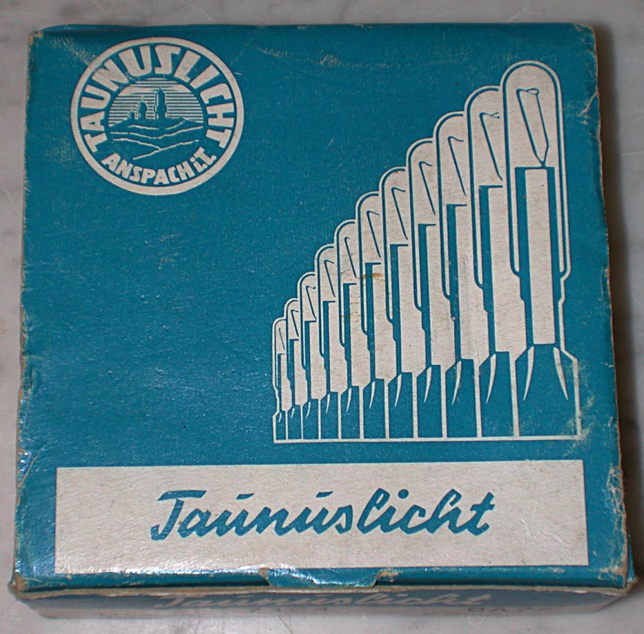 Habe in meinem Fundus 5 volle Taunuslichtschachteln entdeckt und soeben das Taunuslicht-Logo und "Titelbild" einer einzelnen Schachtel zu den Firmenbilder hochgeladen.
