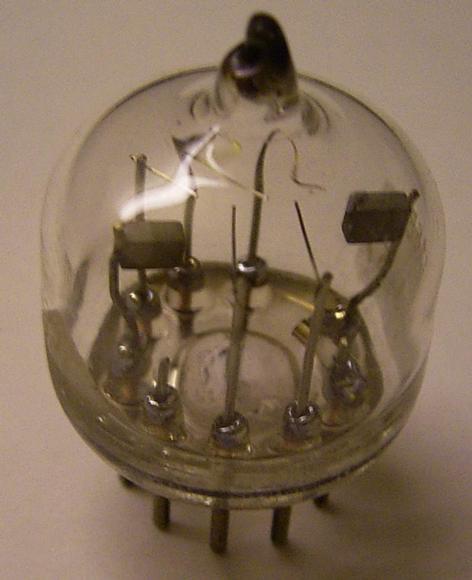 Von den Pins 1,2,3,6,7 gehen dünne Drähte zum Innern der Röhre (ohne Verbindung zueinander). Unter dem Mikroskop sieht man,das diese sauber abgeschnitten enden,also nicht vorher eine Heizung dazwischen war. An den Pins 4 und 9 sind kleine graphitfarbene Quader in der Größe eines SMD-Widerstandes angeschweisst.