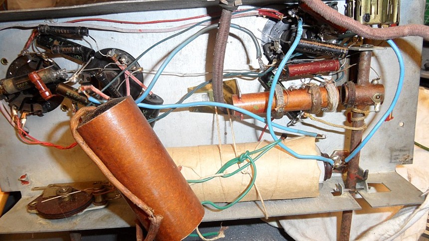 Nun ist das gute Stück angekommen (siehe Bewertung vom 02.04.2011). Ich möchte den Mitgliedern des Radiomuseums einige Fotos nicht vorenthalten. Offensichtlich hat der Verkäufer etwas versucht zu reparieren.