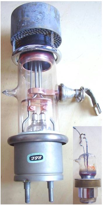 Fig. 2 – 2A shows the internal view of NT99 electrode structure. The squirrel-cage grid is firmly held on the top by a copper cup sealed to the upper glass spacer. The nickel cathode cylinder surrounding the heater is supported by the larger tungsten rod from the bottom sealing glass dome. Pictures 2B and 2C show a 3C37, a variant of British CV55 with coaxial heater connections, and its grid with the finned heatsink.
