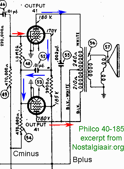 The upper output 41 tube takes it's drive from the audio preamp, and supplies an inverted signal at it's screen grid that is attenuated against it's input signal to drive the control grid of the lower 41 with a net gain of -1.