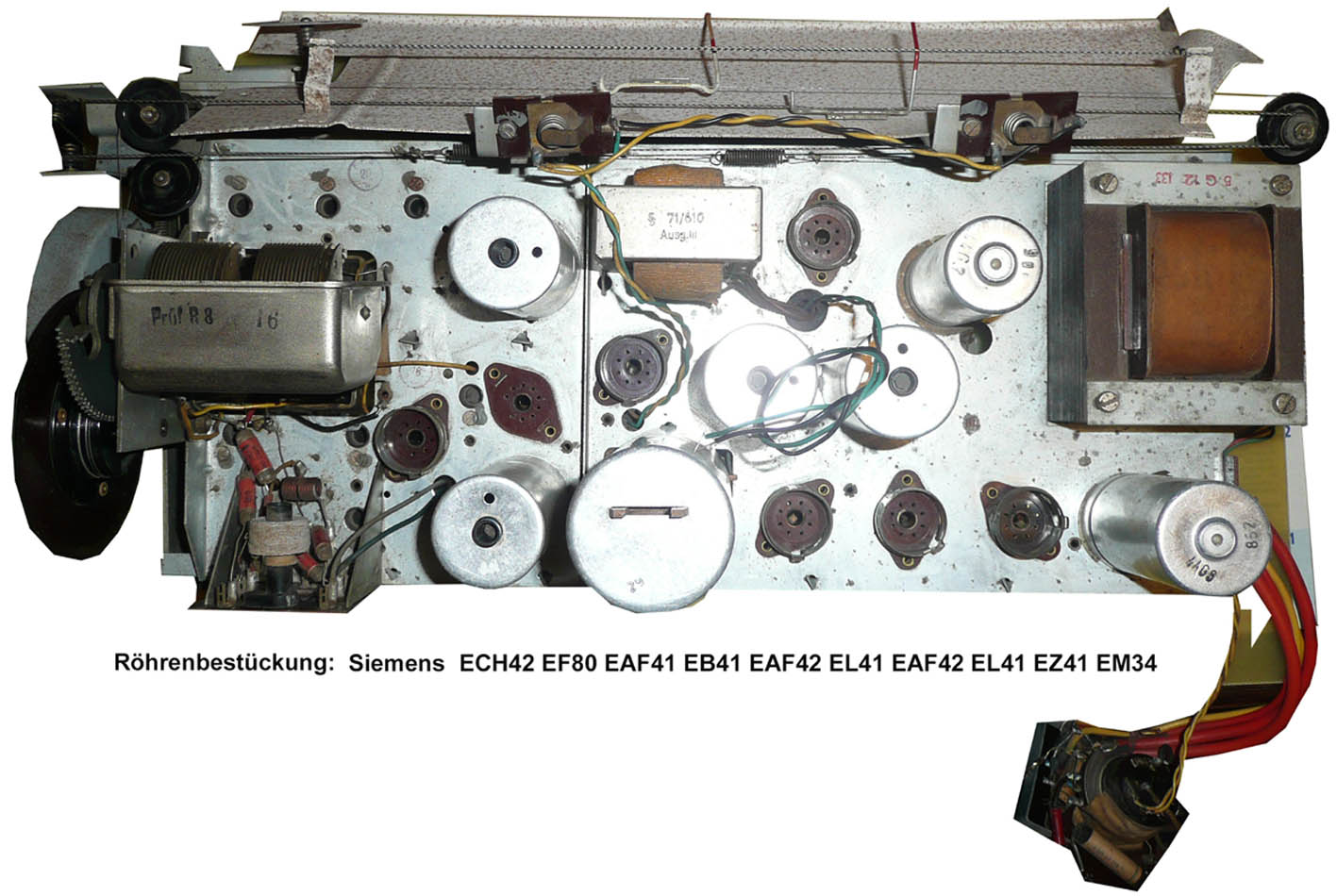 Das Gros der Bauteile, einschließlich der Röhren, trägt das Siemens Logo. Eine Skale ist nicht vorhanden.
