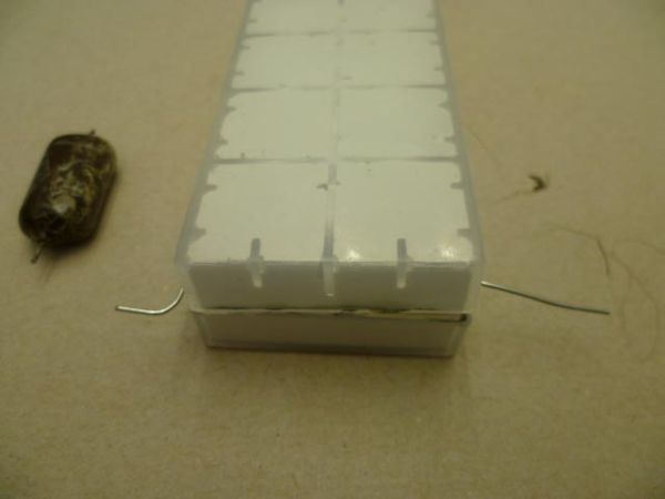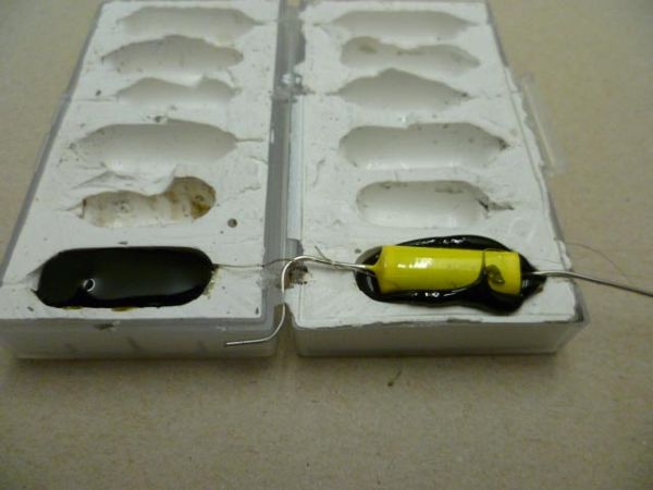 Dazu säge ich zunächst knapp neben der Beschriftung eine Kappe ab. Damit ist das Innere zum Ausbohren zugänglich. Nur wenig größer als nötig bohren, um die Wand nicht zu schwächen, aber etwas tiefer, damit Platz für die Vergußmasse bleibt, sonst bleibt gerne ein Schlitz nach dem Zusammenstecken. Die Anschlußdrähte können leicht nach innen gestoßen werden, wenn man sie mit dem Lötkolben erwärmt. Etwas heißes Bitumen - oder schwarzen Heißkleber - auf die Enden des neuen Kondensators geben und die hohlen Kappen aufstecken, fertig. Die Naht habe ich einfach offen gelassen, der neue C ist ja für sich selbst verpackt. Da die Sägekanten immer aufeinander passen, finde ich das durchaus vorzeigbar.