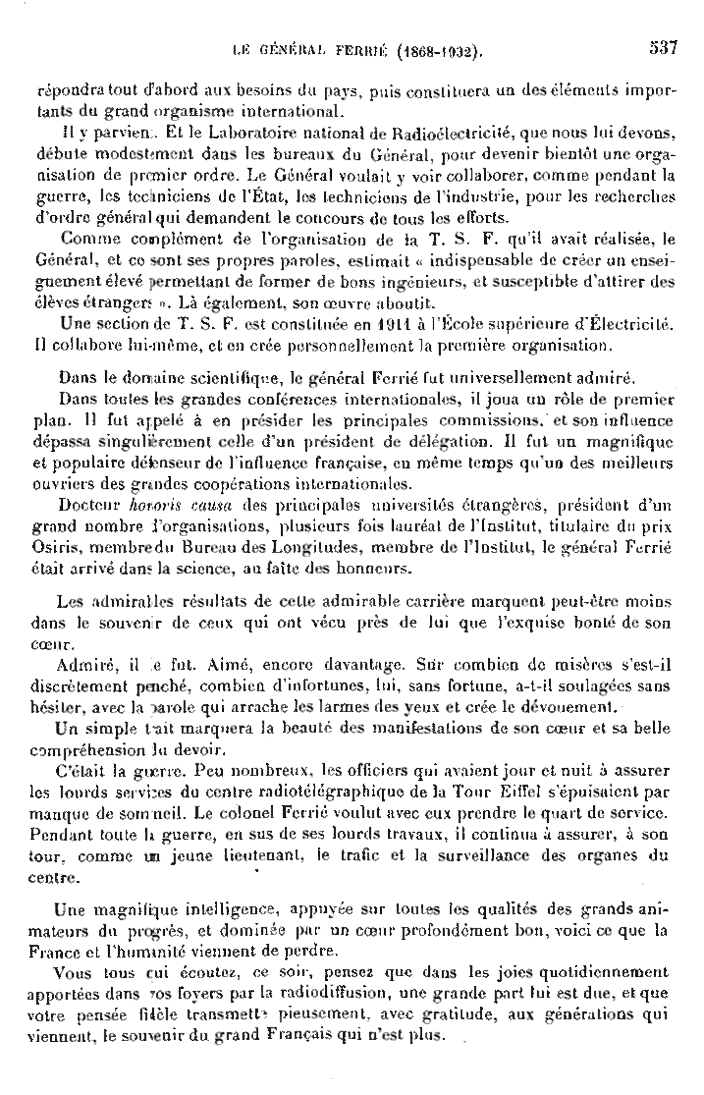 À partir de wikipedia.fr: Gustave Auguste Ferrié, né le 19 novembre 1868 à Saint-Michel-de-Maurienne (Savoie) et mort le 16 février 1932 à Paris 5e, a été un ingénieur et général français, pionnier de la radiodiffusion. Après avoir été nommé en 1899 au comité franco-britannique chargé d'étudier les développements de la télégraphie sans fil, il commence ses travaux avec Guglielmo Marconi. Il expose ses travaux le 22 août 1900, lors du Congrès international d'électricité tenu à Paris du 15 au 25 août 1900, dans le cadre de l'exposition universelle de 1900. Sa communication a pour titre L'état actuel et les progrès de la télégraphie sans fil. Gustave Ferrié y explique que « Le seul système pratique de télégraphie sans fil est celui qui eut pour point de départ la théorie des ondes hertziennes et qui s'est développé grâce à l'expérience d’Édouard Branly, aux travaux de Guglielmo Marconi et aux expériences récentes de Camille Papin Tissot ; mais on ne saurait donner actuellement une théorie parfaite du phénomène ». En 1903, il perfectionne la télégraphie sans fil (TSF) en inventant un nouveau récepteur électrolytique ; la même année il propose l'installation d'une antenne au sommet de la tour Eiffel. Il conduit ses travaux avec trois officiers de marine : Camille Tissot, Maurice Jeance et Victor Colin. La portée de l'émetteur, d'abord de 400 km, passe en 1908 à près de 6 000 km. Pendant la Première Guerre mondiale, il développe la radiotélégraphie pour les unités d'infanterie et d'artilleurs et devient ainsi l'un des artisans de la victoire de 1918. Cette démarche est concrétisée en mars 1918 par sa nomination, par l'intermédiaire du général Mordacq, à la tête de l'Inspection des télégraphies militaires. Concrètement, dès 1914, il propose des modifications techniques permettant un meilleur échange entre l'émetteur et le récepteur, doté d'un triode. Durant la guerre, ses postes de radio ont été construits à plus de 10 000 exemplaires. Nommé général en 1919 à 51 ans, il est élu membre de l'Académie des sciences en 1922 et inspecteur général de la télégraphie militaire. En 1917, il est nommé « compagnon de l'Institut international des ingénieurs de radio » (Institute of Radio Engineers), et reçoit en 1931 la médaille d'Honneur (IEEE Medal of Honor) pour son travail pionnier dans le développement de la radiocommunication en France et dans le monde. L'université d'Oxford lui décerne un doctorat honoris causa en 1919. Il est le premier président du Comité national de géodésique et de géophysique (1920-1926). Il est président de l'Union internationale de la radio et de la Commission internationale des longitudes par radio, ainsi que vice-président du Bureau international des unions scientifiques. Grand-croix de la Légion d'honneur, il meurt à l'hôpital militaire du Val-de-Grâce à Paris en 1932 à l'âge de 64 ans, victime d'une crise d'appendicite. Passionné par son travail et ne souhaitant pas s'interrompre, il tarde en effet à rejoindre l'hôpital. Il est inhumé au cimetière du Père-Lachaise (89e division).