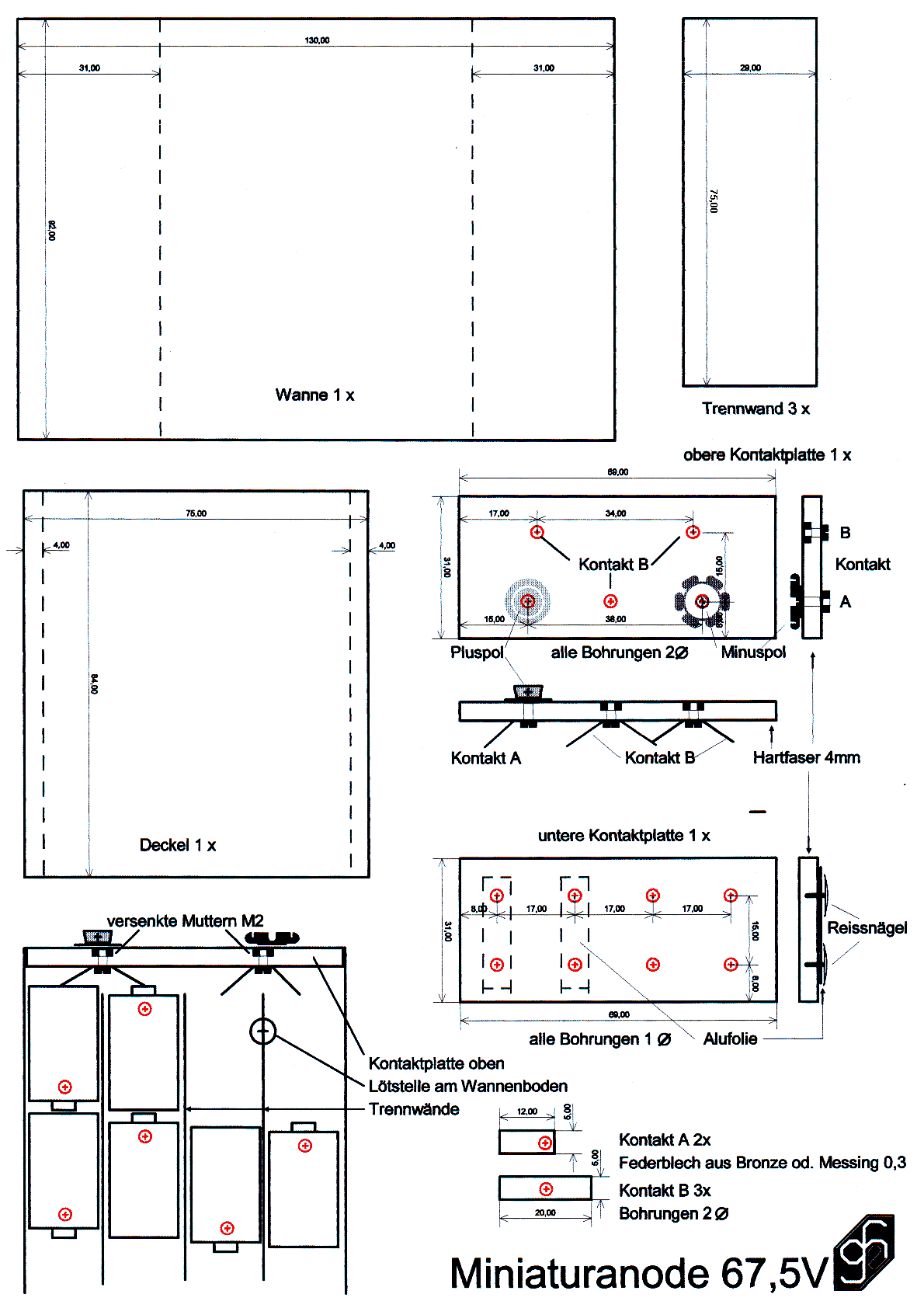 Zusammenbau: Die zugeschnittenen Gehäuseteile (Wanne, Deckel) werden U-förmig gebogen, dann die Trennwände in die Wanne gelötet, bei Alublech geklebt. Je 2 Lötstellen an den Enden genügen. Die Trennwände müssen einen grösseren Abstand zur oberen Kontaktplatte haben, um Kurzschlüsse mit den Kontakten A und B zu vermeiden.