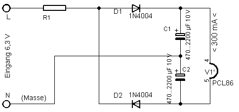 Warum man die Lösung mittels Spannungsverdopplung verwirft, erschließt sich mir nicht, es sei denn, man hat genau zur PCL86 passende Heiztrafos in Mengen herumliegen.