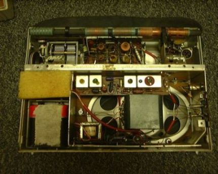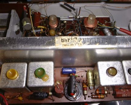 die beiden Endstufentransistoren: erscheinen diese noch originalverdrahtet? Welche Farbe hat die Unterseite der Transistoren - rund um die Anschlussdrähte -: schwarz oder milchig weiß? Schwarz wären die Tfk-Typen OC604spez (tauchlackiert, mit Tfk-Schelle; auch Version mit Kühlhülse über Glasgehäuse und Normalschelle gab es. In jedem Fall ca. 20mm lang), milchig weiß die Valvo-Typen OC72 bzw. OC74 (nur ca. 15 mm lang).