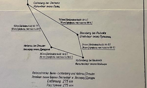 Am 17.10.1949 wurde auf Wunsch und im Beisein der Kommission die gesamte Stecke Berlin- Dresden über 5 Relaisstrecken vorgeführt. Bei allen Versuchen wurde kein Übersprechen gehör- und auch meßmäßig festgestellt.