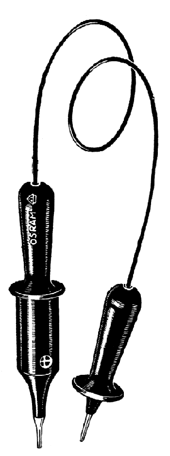 Für die vorstehend erwähnten Zwecke werden ferner als besonders handliche Pol- und Stromschlußprüfer röhrenförmige Glimmlämpchen in Hülsen aus Isoliermaterial benutzt. Abb.21 zeigt ein solches Gerät von Osram mit Taststiften. Zur Sichtbarmachung der Polung eines Netzes ist die Glimmröhre hinter Ausschnitten in Form eines Plus- und eines Minuszeichens angeordnet, so daß das Aufleuchten der einen oder der anderen Aussparung im Gleichstromfalle die Polarität des abgetasteten Leiters direkt angibt. Bei Wechselstrom leuchten natürlich beide Zeichen.