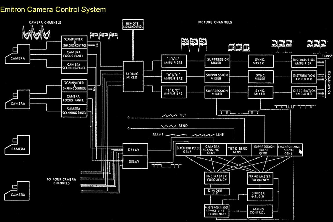 Note that black is at the top in each picture and that the strong negative going (white) impulses are not sync. pulses but are spurious video signals generated by the mosaic during line and frame flybacks. A suppression mixer in the transmission system applies cancellation pulses in the flyback periods that return/maintain the video signal at black level prior to the addition of the actual line and frame sync. pulses. The photo below shows the Marconi-EMI camera control racks in March1936.