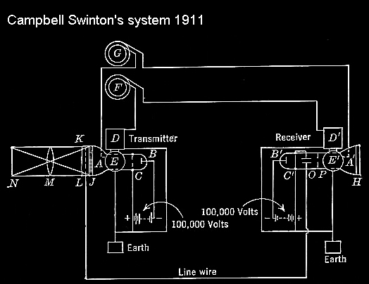 Campbell Swinton describes the screen J as gas tight and formed of a number of small metallic cubes insulated from each other but presenting a clean metallic surface to the cathode rays on the one side and to a suitable gas or vapour, e.g. sodium vapour on the other. The metallic cubes are made from a metal such as rubidium which is strongly active photoelectrically in readily discharging negative electricity under the influence of light. The receptacle K filled with e.g. sodium vapour, conducts negative electricity more readily under the influence of light than in dark. Parallel to the screen J is a metallic gauze L and the optical image is projected through the gauze onto the screen J through the vapour contained in K.