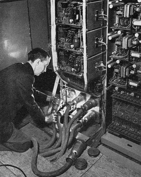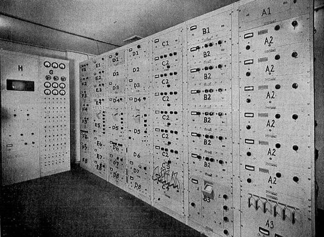 The racks were arranged differently when installed at Alexandra Palace. The vision equipment is on the left with all the tilt and bend controls up close to the monitors and the sound equipment on the right.
