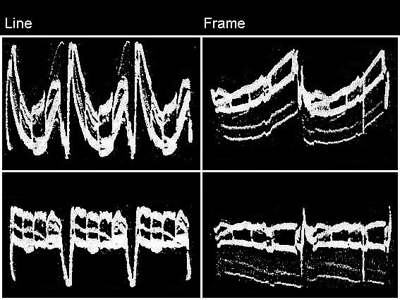 Below the uncorrected Line (top left) and Frame (top right) signals as they appear from the mosaic signal plate are shown along with the corrected Line (bottom left) and Frame (bottom right) as at the outputs of the A,B and C amplifiers.