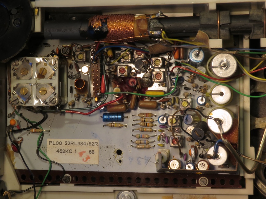 Ich habe einen zweiten Apparat des gleichen Typs. Er hat immer funktioniert, wie ich ihn jetzt anschliesse ans Netzgerät, läuft er nicht. Also auch hier: Zinnfaser-Transistoren! Ein paar Mal den Lautstärkeregler Hin- und Herbewegen bringt an den Tag: das Radio läuft doch, der Potentiometer selber ist der schuldige. Ausserdem bleibt der Schalter hängen; wenn das Gerät ausgeschaltet ist, rauscht und kratzt es fröhlich weiter.