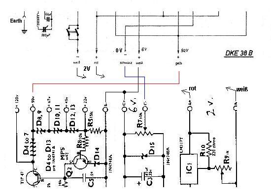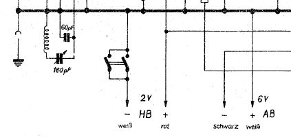 I have started working on my DKE38-B. This radio takes three input voltages, +90, +6, and +2. You'd think this should be pretty straightforward. However, looking at the schematic, I am confused. Look at the +6 volt lead (the "+ weiss" line) in the diagram below: