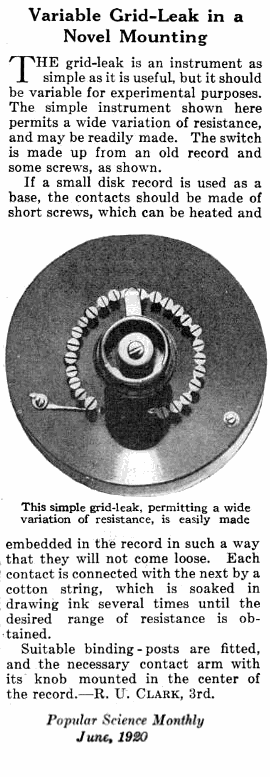 > A few adjustable grid leaks from the early 1920s used metal wipers against paper coated with India ink. But they didn't work very well or for very long.
