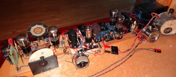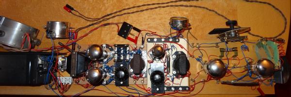 Ein Drehkondensator ist Eigenbau im Stile des Baukastens, die benötigte weitere Spule zur Audionabstimmung ist von "Dr. Lertes". Dazu kommt ein NF- Vorverstärker mit RE073d , danach eine Gegentakt- Endstufe mit 2x RE074d. Damit war der Vorrat an Raumladegitter-Röhren ausgeschöpft.