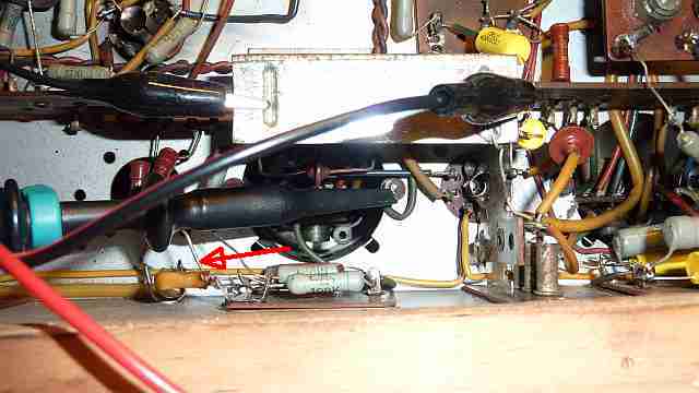 auf der Pertinaxplatte befindet sich oben links die UKW-Spule (Eingangstrafo S8/S9), die fest auf ca. Bandmitte abgestimmt ist. Die untere mittig montierte Induktivität ist der ZF-Saugkreis S1 für 473 kHz. Diese beiden Abgleichpunkte müssen in der Regel nicht nachgeglichen werden. Gut sichtbar sind die Spulen auf einer Seitenansicht beim Modell, Bild-ID 435121.