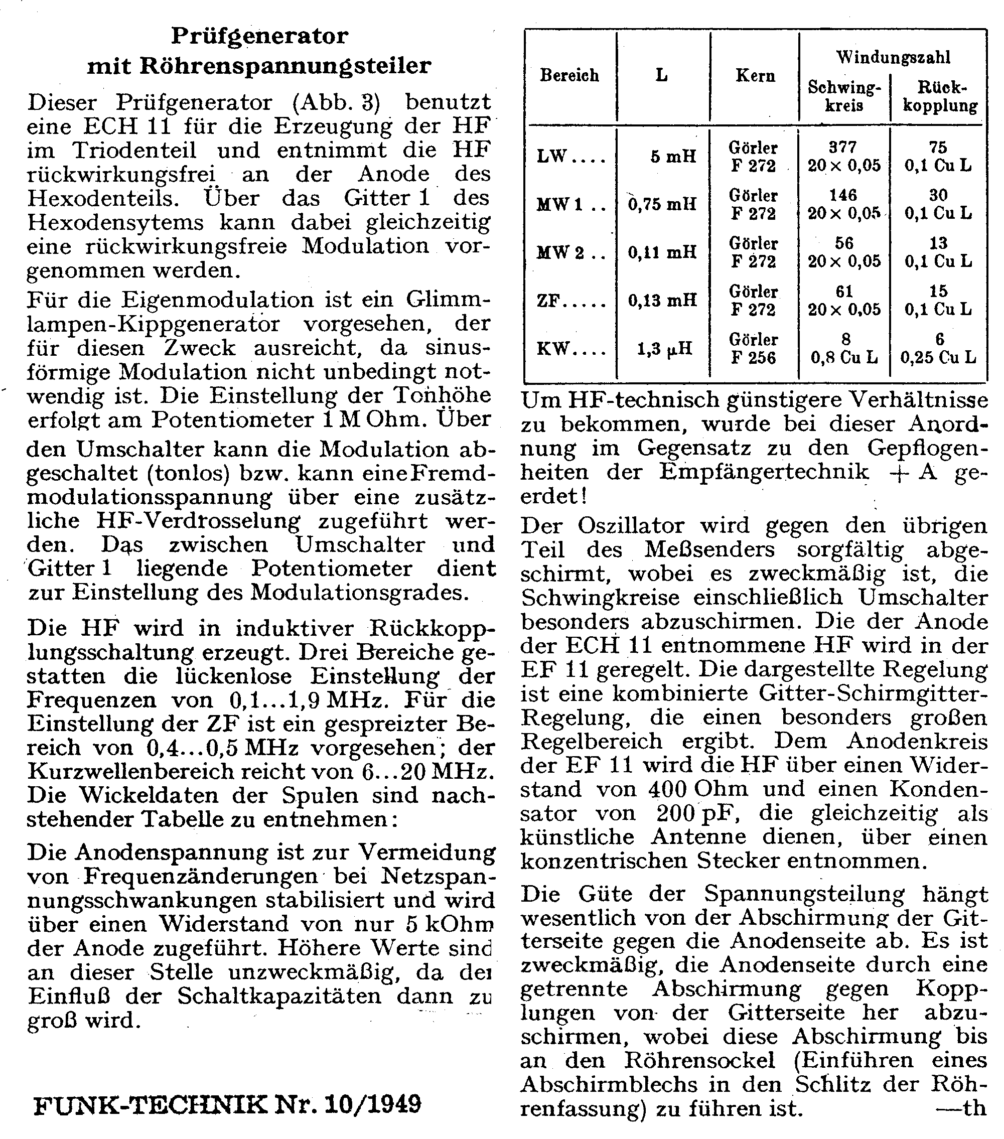 Doch wenn jemand auch bereit ist, mit solchen HF-Generatoren zu experimentieren, so möchte ich hier noch eine Seite aus der Funkschau 7/1946 vorstellen. Da wird beschrieben, wie man einen einfachen Einkreiser mittels der Rückkopplung als Prüfsender nutzen kann.