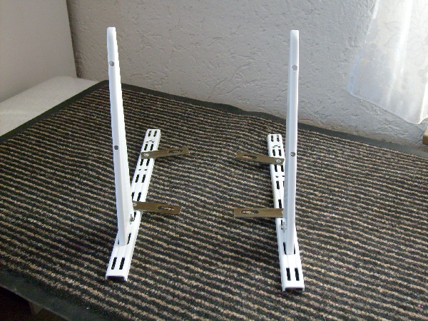 Es besteht vollständig aus Standardteilen, die in jedem Eisenwarengeschäft oder Baumarkt für kleines Geld zu haben sind : 2 Regalschienen 40cm lang (2- reihig) mit 2 Trägern, 27cm Ausladung. Alles geht ohne Gewindeschneiden oder-bohren. Die einzige "Herausforderung" besteht in der festen Verbindung vonSchiene und Träger, dazu habe ich ein Foto gemacht : Durch die Mutter M10, welche in den Träger als Verbindungselement kommt, wird längs ein 4 mm-Loch exzentrisch gebohrt, so dass eine Querschraube M5 noch hindurchpasst,(Quer durch den Träger), evtl. ausfeilen. Andere Verbindungsarten sind Eurer Fantasie überlassen.Das Anfertigen der 4 Schwenklaschen ist aus den Fotos ersichtlich.