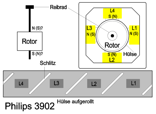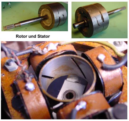 Der Rotor besteht aus einem homogenen Material, es ähnelt den Permanentmagneten alter Lautsprecher. Aufbau des Motors: die 4 Spulen sind im 90° Winkel angebracht. Zwischen Spulen und Rotor befindet sich eine Metallhülse (Eisen) mit 4 schrägen Schlitzen zwischen den Spulen.